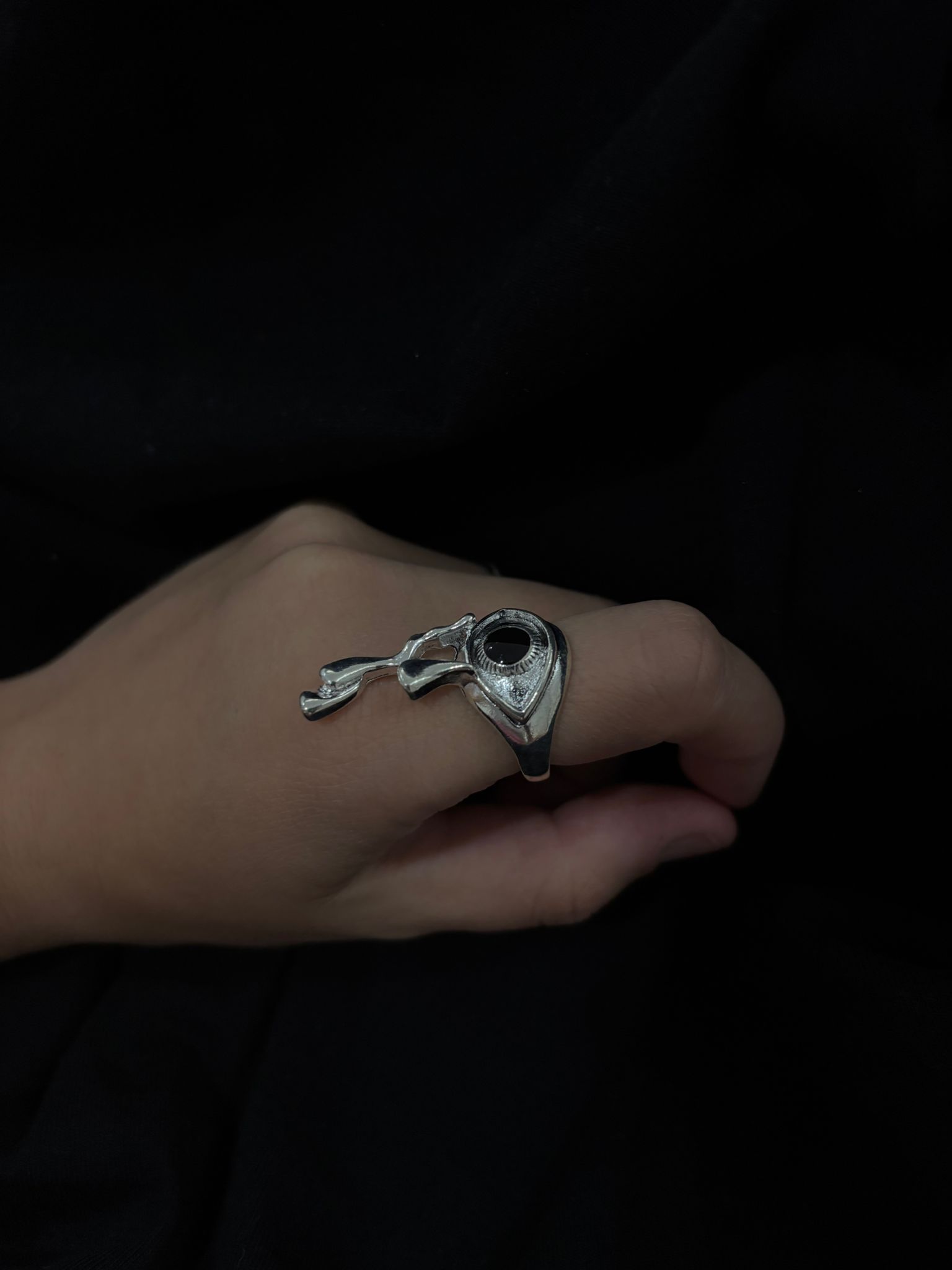 Antik gümüş tonlu yüzüğün üst kısmında yer alan siyah taşlı göz detayı, içsel gücü ve karanlık sezgiyi temsil eder. Uzanan karga gagası formundaki yüzey, yüzüğe hem hareket hem de karakter kazandırır.
